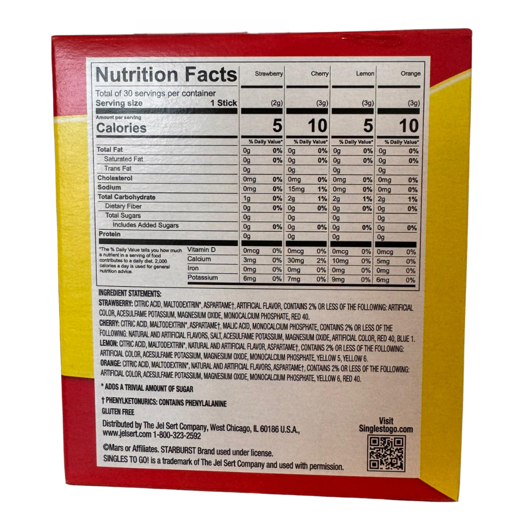 - SUGAR-FREE – Starburst Singles To Go drink packets are low-calorie water enhancers that are sugar-free so you can feel great about sharing them with the whole family.