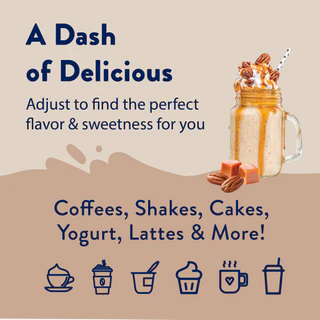 Sweet and luscious caramel combines with buttery pecans to create a unique flavor for your favorite beverages. Add guilt-free flavor to coffees, lattes, tea, protein shakes, smoothies, baking, oatmeal or just about anything.