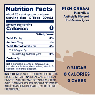Sugar Free Irish Cream Syrup is a combination of vanilla, chocolate, cream, and whiskey flavors. The perfect way to make your favorite beverages taste indulgent, but without the unwanted calories. Add guilt-free flavor to coffees, lattes, tea, protein shakes, smoothies, baking, oatmeal, or just about anything.